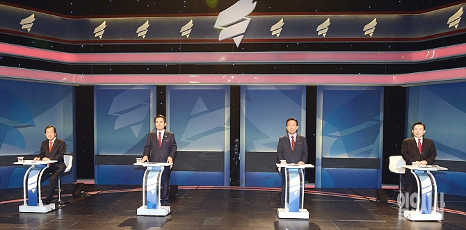 (사진 왼쪽부터)홍준표 경남도지사, 김진태 의원, 김관용 경북도지사, 이인제 전 자유한국당 최고위원이 27일, 서울 양천구 목동 SBS스튜디오에서 '대선후보 TV토론회'에 앞서 기념촬영을 갖고 있다. (국회사진취재단)