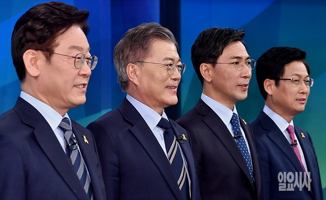 (사진 왼쪽부터)이재명 성남시장, 문재인 전 더불어민주당 대표, 안희정 충남도지사, 최성 고양시장이 30일, 서울 목동 SBS스튜디오서 예정된 '더불어민주당 대선후보 토론회'에 앞서 기념촬영을 갖고 있다. (국회사진취재단)