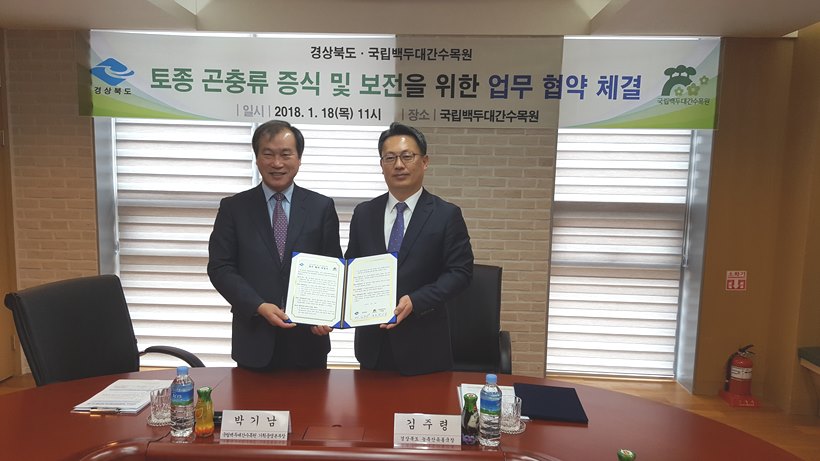 [일요시사 정치팀] 박 일 기자 = 경상북도(도지사 김관용)는 18일, 국립백두대간수목원 회의실서 국립백두대간수목원과 ‘토종 곤충류 증식 및 보전’을 위해 상호협력하기로 하고 MOU를 체결했다.