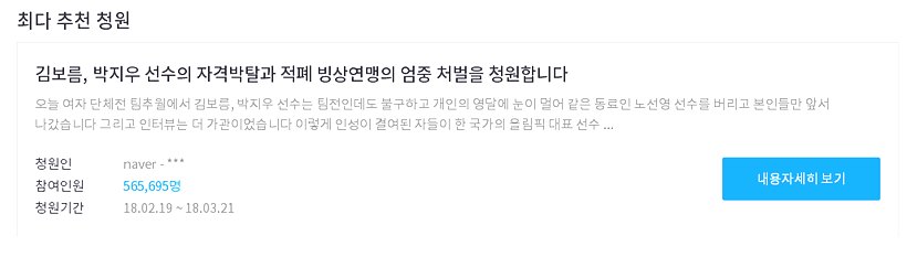 #1. 설 명절 연휴 다음날인 지난 19일 오후 포털 사이트 실시간 검색어 순위에 ‘청와대 국민청원’이 올라오기 시작했다. 2018 평창 동계올림픽 스피드 스케이팅 여자 팀추월 경기가 끝난 이후였다. 경기 내용과 선수들의 인터뷰가 국민을 자극했고 분노는 청와대 국민청원 게시판서 폭발했다.