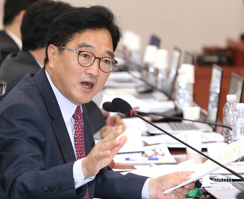 우원식 더불어민주당 의원이 18일, 서울 여의도 국회 산업통상자원중소벤처기업위원회의실서 속개된 한국수력원자력 등에 대한 국정감사 도중 정재훈 한수원 사장에게 질의하고 있다.