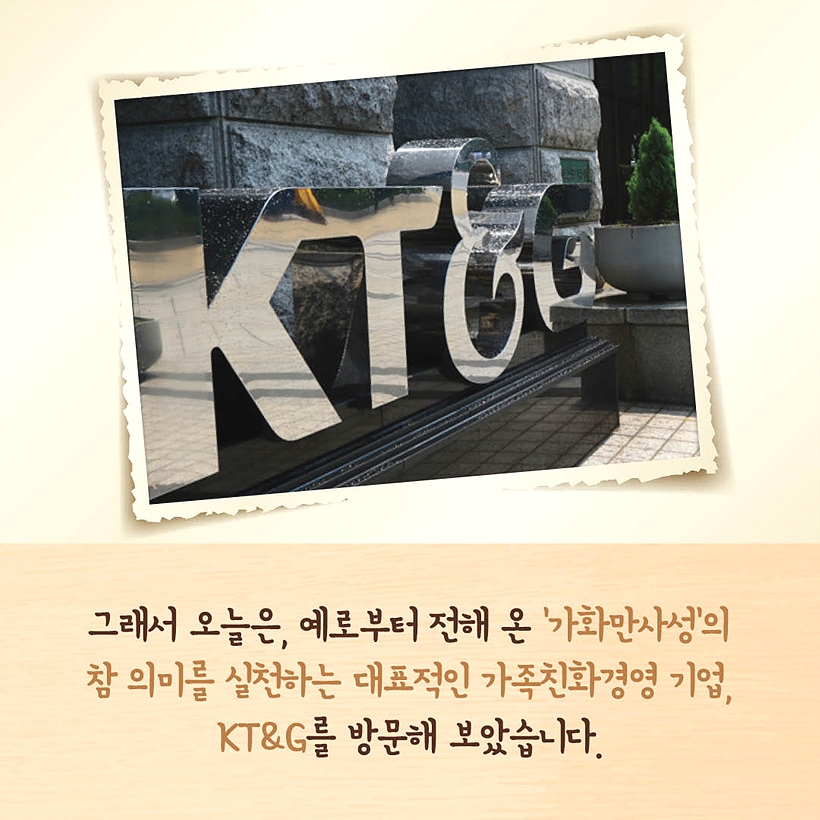 그래서 오늘은 예로부터 전해온 ‘가화만사성’의 참 의미를 실천하는 대표적인 가족친화경영 기업, KT&G를 방문해봤습니다.