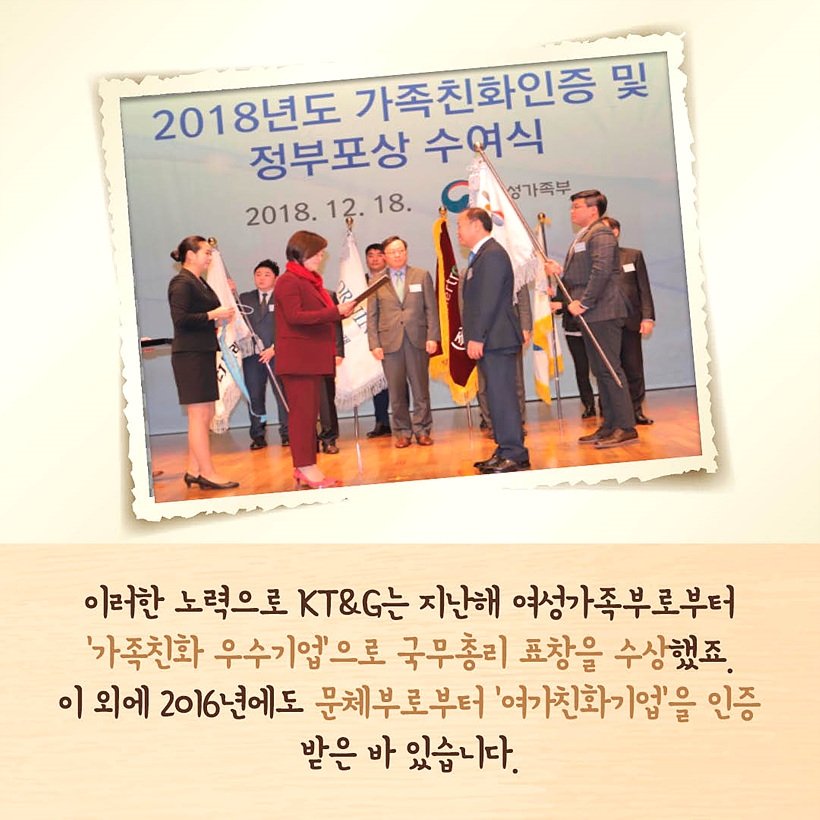 이 같은 노력으로 KT&G는 지난해 여성가족부로부터 ‘가족친화 우수기업’으로 국무총리 표창을 수상했죠.