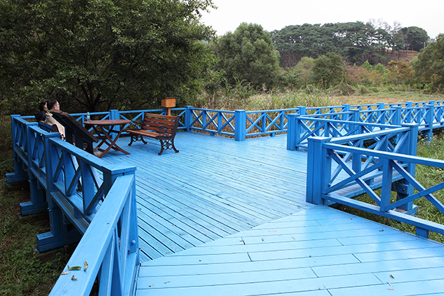 다음은 네 번째 스탬프 지점인 판문점 도보다리 재현 시설이다. 2018년 4월 1차 남북정상회담에서 화제를 모은 판문점 도보다리, 남북 정상이 마주한 의자와 탁자가 있다. 여기서 습지 위로 놓인 데크 산책로를 따라가면 다섯 번째 스탬프 지점인 9남매 왕버들을 만난다.