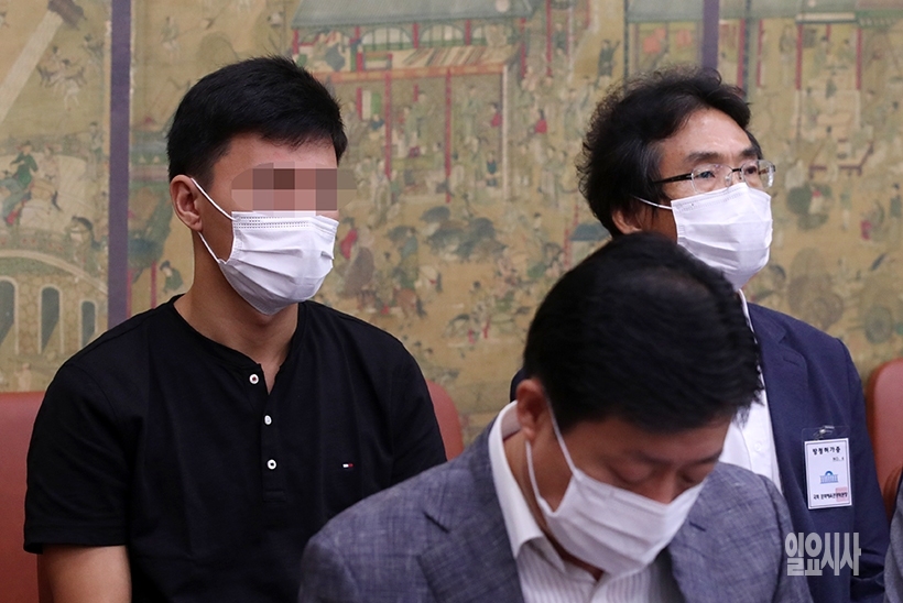 22일 서울 여의도 국회 문화체육관광위원회에서 열린 ‘철인 3종경기 선수 가혹 행위 및 체육 분야 인권침해에 대한 청문회’에서 가해 사실을 인정한 김도환 선수(왼쪽)가 자리에 앉아 있다.