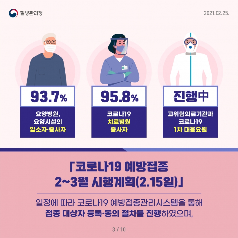 코로나19 예방접종 대응 추진단은 2~3월 시행계획 일정에 따라 코로나19 예방접종관리시스템을 통해 접종 대상자 등록 및 동의 절차를 진행했고 등록 대상자들에 대한 월활한 접종 시행을 위해 백신 및 대상자의 특성에 따른 맞춤형 유통 및 접종 절차를 마련했다고 밝혔습니다.