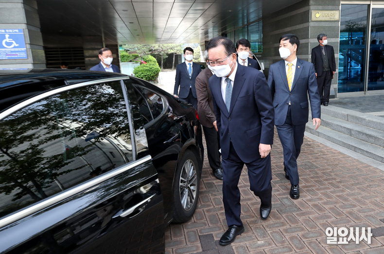 김부겸 국무총리 후보자가 16일 오후 서울 종로구 금융감독원 연수원 앞에서 취재진에게 발언을 마친 뒤 차량으로 향하고 있다.