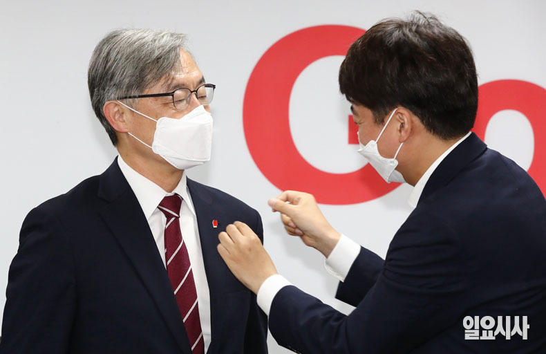최재형 전 감사원장(왼쪽)이 15일 오전 서울 여의도 국민의힘 중앙당사에서 열린 국민의힘 입당 환영식에서 이준석 대표에게 당 배지를 받고 있다.
