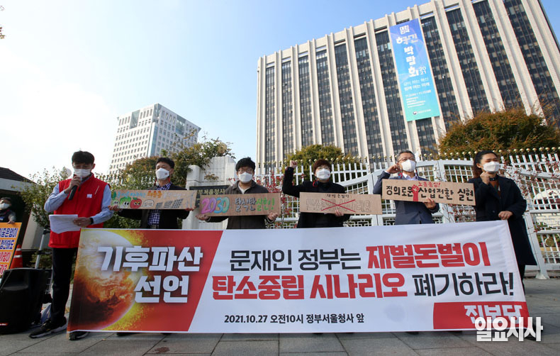 이날 정 위원장은 "정부가 제출한 2030년 NDC는 기후위기 대응을 위한 최소한의 의지도 보이지 않는 기후파산 계획"이라며 "재벌 기득권의 돈벌이만을 챙기는 탄소중립 시나리오를 폐기하라"고 주장했다.