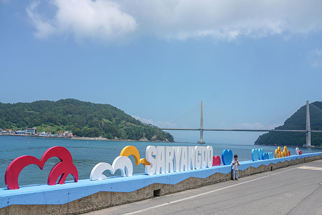 덕동항 근처엔 사량대교를 배경으로 한 포토 존이 있어 기념사진을 찍는 이가 많다.