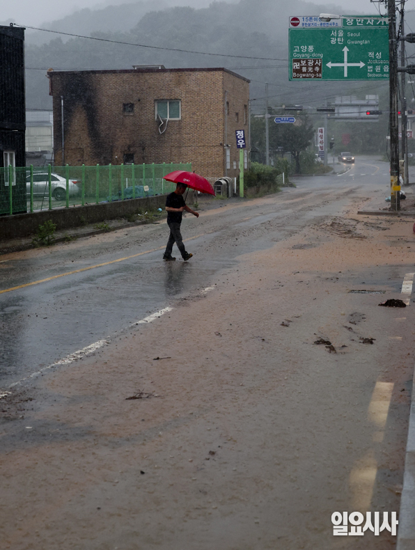 경기북부 일부 지역에 시간당 최대 170mm의 폭우가 쏟아진 가운데 17일 오후 경기 파주시 광탄면 창만사거리 일대에서 인근 지역 주민이 물에 잠겼던 거리를 손으로 가리키고 있다.