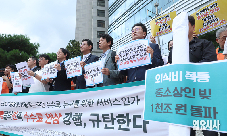 배달의민족 가맹점주들이 7일 오전 서울 송파구 우아한형제들 본사 앞에서 열린 '배달의민족 수수료 인상 강행 규탄 기자회견'에서 박주민 을지로위원회 위원장을 비롯한 더불어민주당 의원들에게 요구서한을 전달하고 있다.