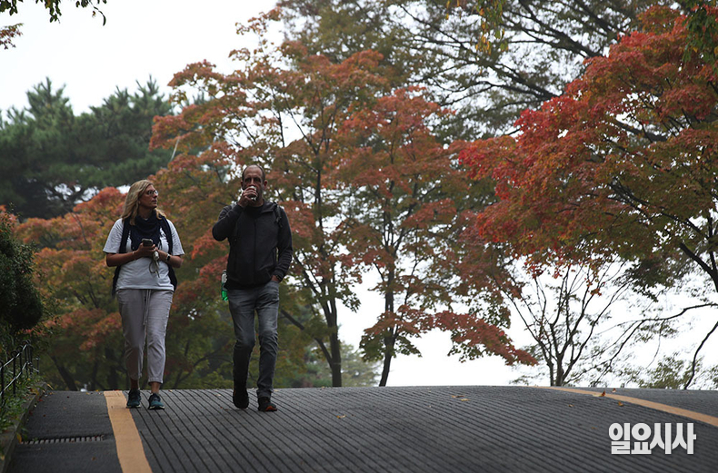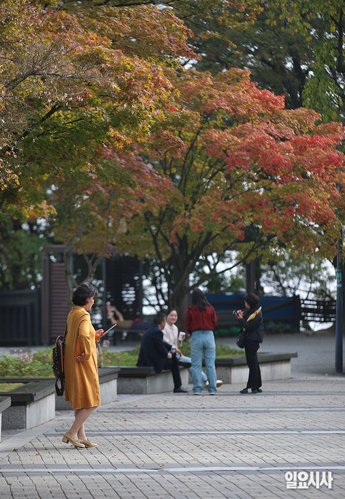 16일 오전 서울 용산구 남산서울타워에서 한 시민이 붉게 물든 단풍을 촬영하고 있다.