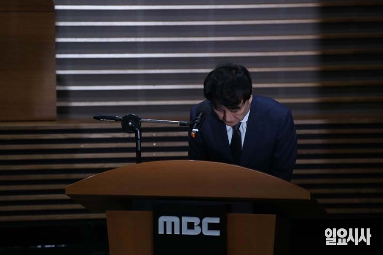 안형준 MBC 사장이 15일 오전 서울 마포구 상암동 MBC 본사 1층 골든마우스홀에서 열린 고(故) 오요안나씨의 유족과 조인식 및 기자회견에서 고개숙여 인사하고 있다.