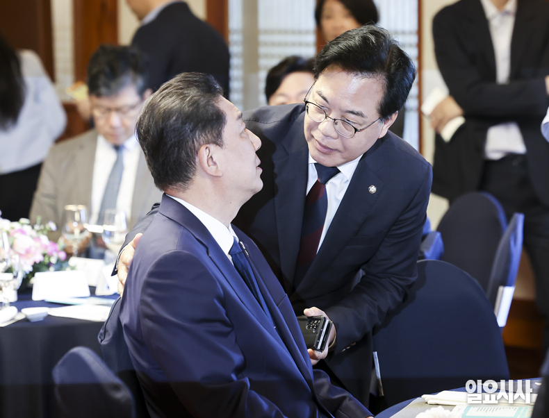더불어민주당 김병기 원내대표와 국민의힘 송언석 원내대표가 15일 오전 서울 여의도 국회 사랑재에서 열린 '국회 사회적 대화 공동선언식'에서 만나 대화를 나누고 있다.