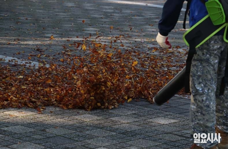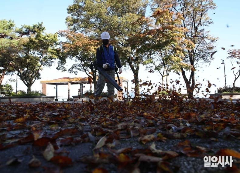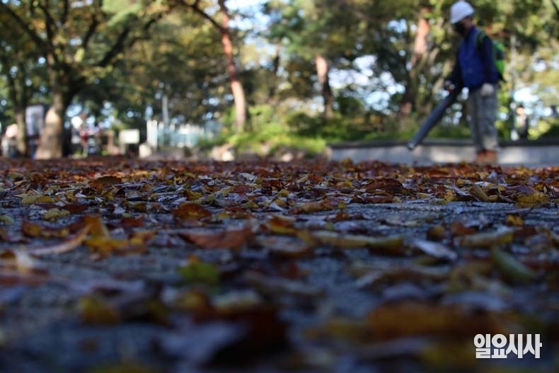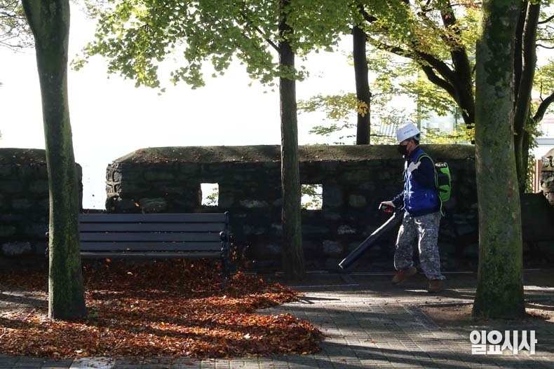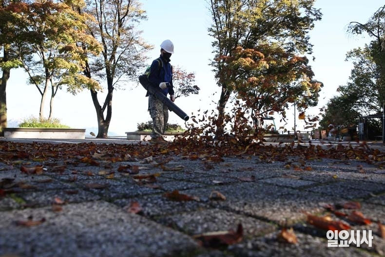 청명한 가을 날씨를 보이고 있는 16일 오전 서울 중구 남산공원에서 관계자가 송풍기를 이용해 떨어진 낙엽을 치우고 있다.