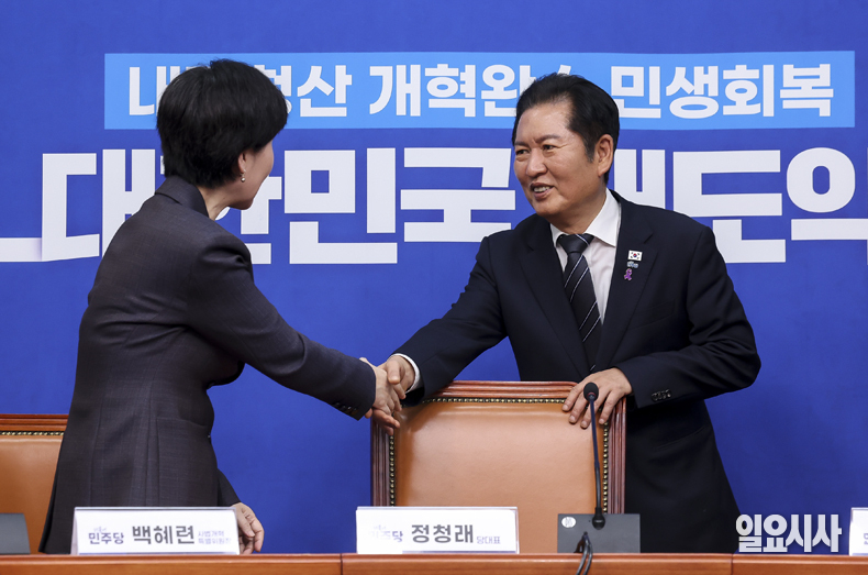 더불어민주당 정청래 대표와 백혜련 사법개혁특별위원회 위원장이 20일 오후 서울 여의도 국회에서 열린 사법개혁특별위원회 사법개혁안 발표 현장에서 만나 악수하고 있다.
