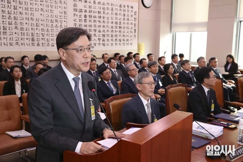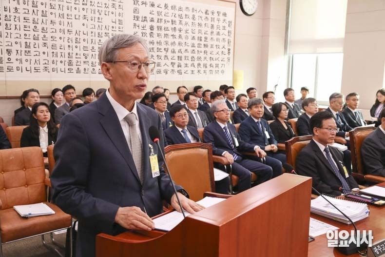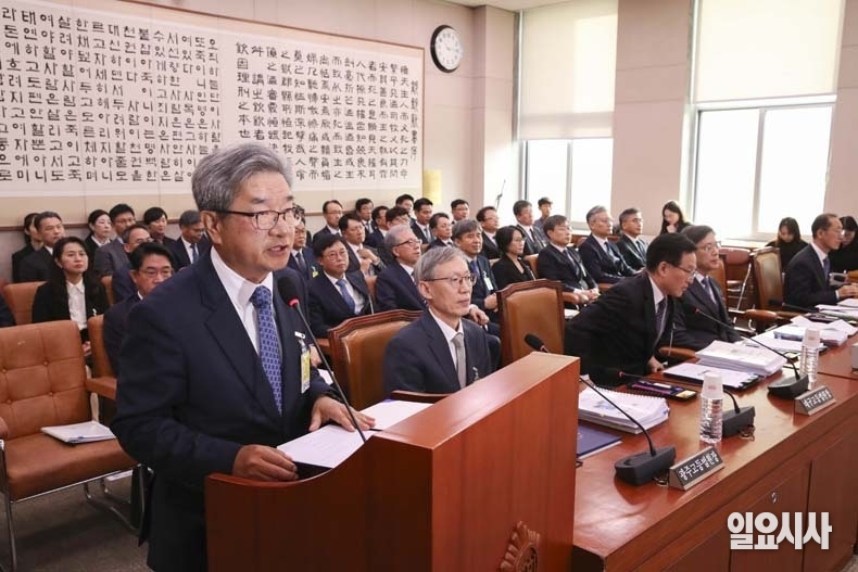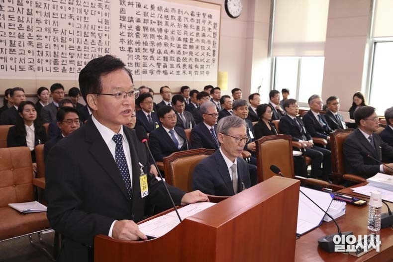 이원범 대전고등법원장이 21일 오전 서울 여의도 국회에서 열린 법제사법위원회 대전고등법원 등에 대한 국정감사에서 증인선서를 하고 있다.