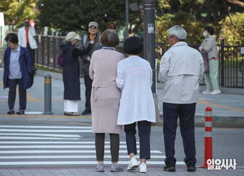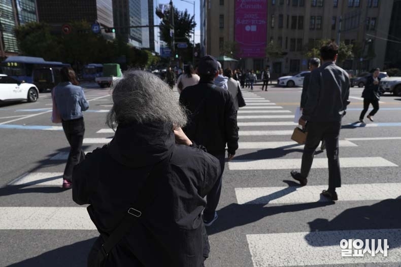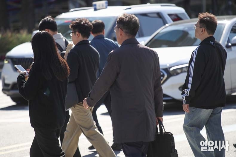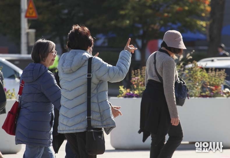 아침 최저기온이 5도 안팎으로 쌀쌀한 날씨를 보인 22일 오전 서울 종로구 광화문네거리에서 얇은 옷을 입고 외출한 시민들이 팔짱을 끼고 추위를 녹이고 있다.