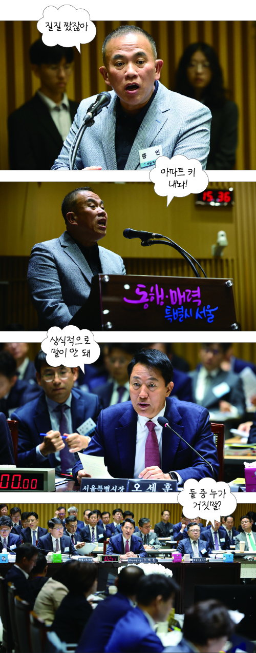 지난 23일 국회 행정안전위원회의 서울시 국정감사장서 증인으로 소환된 명태균씨가 오세훈 서울시장과 공방을 벌였다. 윤석열 부부의 공천 개입 의혹의 핵심 인물인 명씨는 “오 시장이 울면서 부탁했다. 질질 짰다” “당선되면 서울 아파트 한 채도 주겠다고 약속했다” 등 폭로를 이어갔다. 이에 대해 오 시장은 “자세한 내용은 특검에서 밝히겠다”며 말을 아꼈다. 명씨는 다음 달 8일 피의자 신분으로 김건희 특검에 출석해 오 시장과 대질 조사를 받을 예정이다.