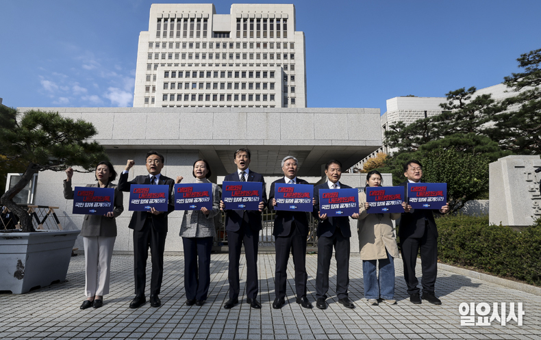 조국혁신당 조국 비상대책위원장 등 참석자들이 28일 오후 서울 서초구 대법원 앞에서 열린 '대법원 내란회의록 공개 및 조희대 사퇴 요구 기자회견'에서 구호를 외치고 있다.