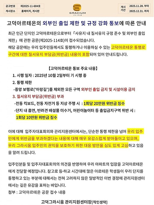 해당 공문에는 지난 10월2일부터 규정을 시행한다는 문구를 포함해, 외부인의 무분별한 단지 내 출입과 시설 이용을 엄격히 제한하고 위반 시 금전적 제재를 가한다는 내용이 담겼다.