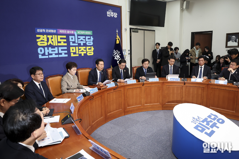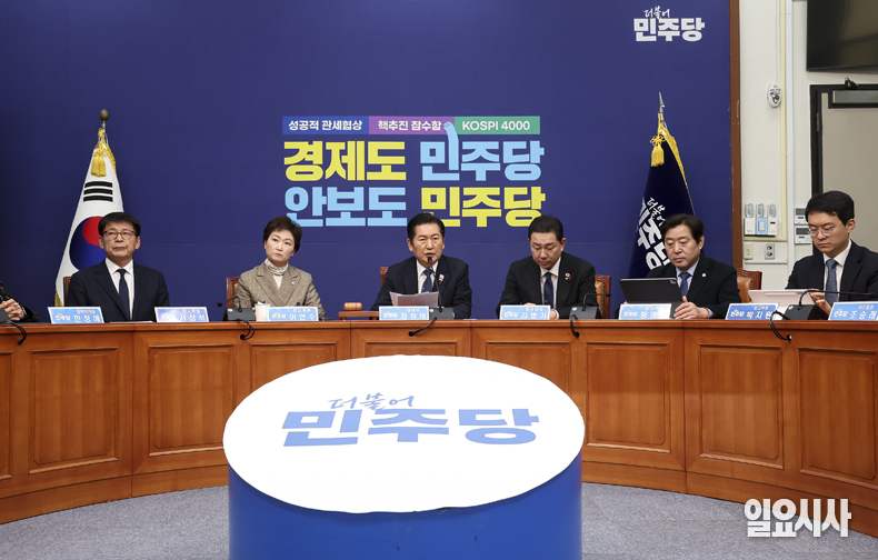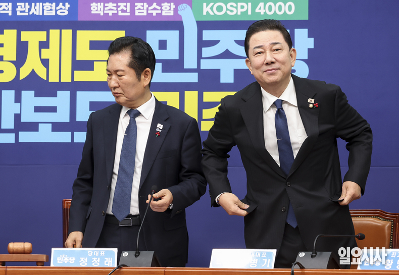 더불어민주당 정청래 대표와 김병기 원내대표가 8일 서울 여의도 국회에서 열린 최고위원회의에 참석하고 있다.