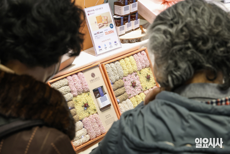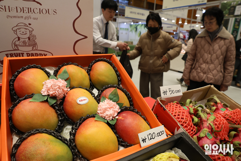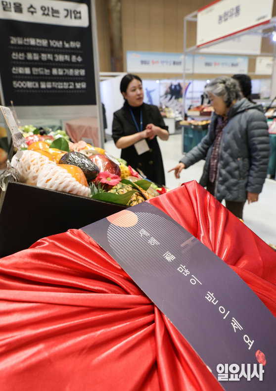 연말연시를 앞두고 12일 오후 서울 강남구 코엑스에서 열린 ‘설맞이 명절 선물전’을 찾은 시민들이 부스에 진열된 과일 선물세트를 살펴보고 있다.