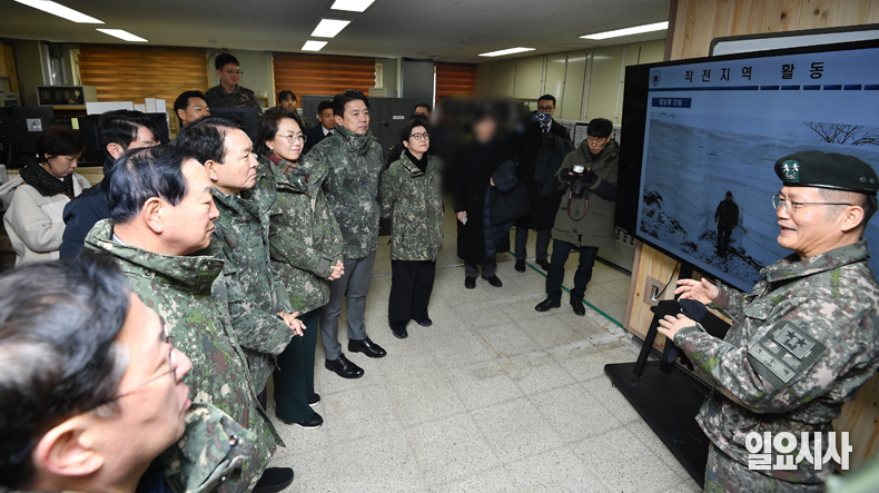 성일종 위원장(오른쪽에서 두 번째) 등 국회 국방위원회 위원들이 22일 오전 강원도 인제군 12사단 향로봉경계작전중대를 위문 방문해 브리핑을 듣고 있다.