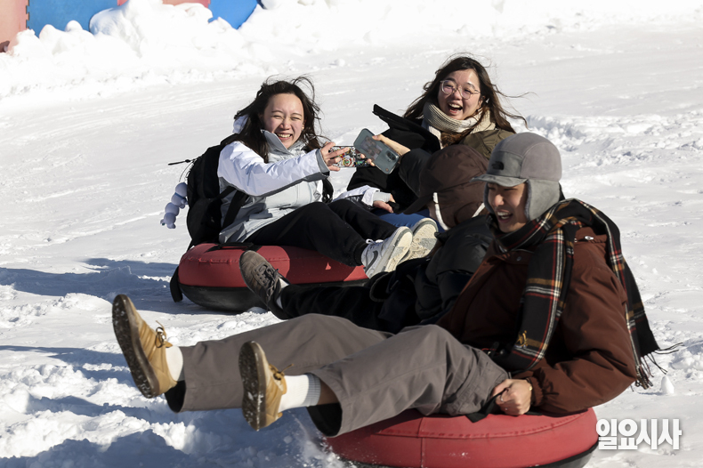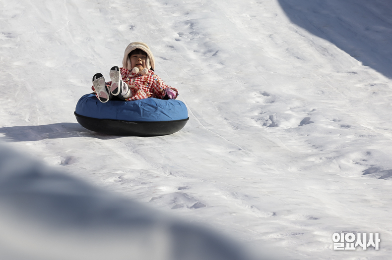 세밑 한파가 찾아온 31일 서울 광진구 뚝섬한강공원 눈썰매장을 찾은 시민들이 썰매를 타며 즐거운 시간을 보내고 있다.