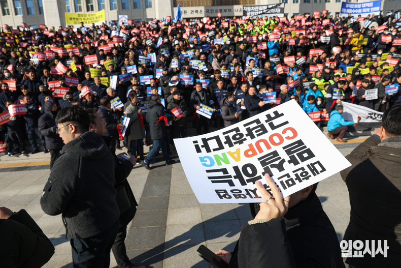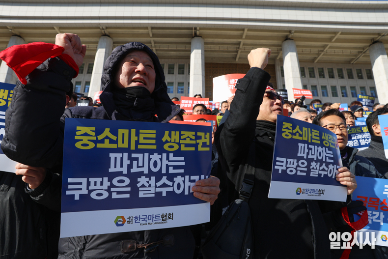 자영업 단체 소속 자영업자들이 7일 오후 서울 여의도 국회 본청 앞 계단에서 열린 ‘자영업 말살하는 쿠팡 규탄 대회’에 참가해 구호를 외치고 있다.