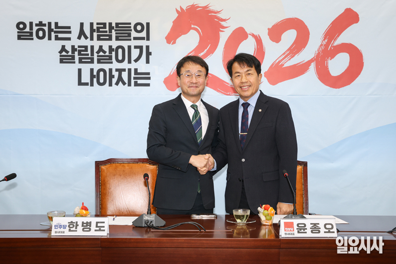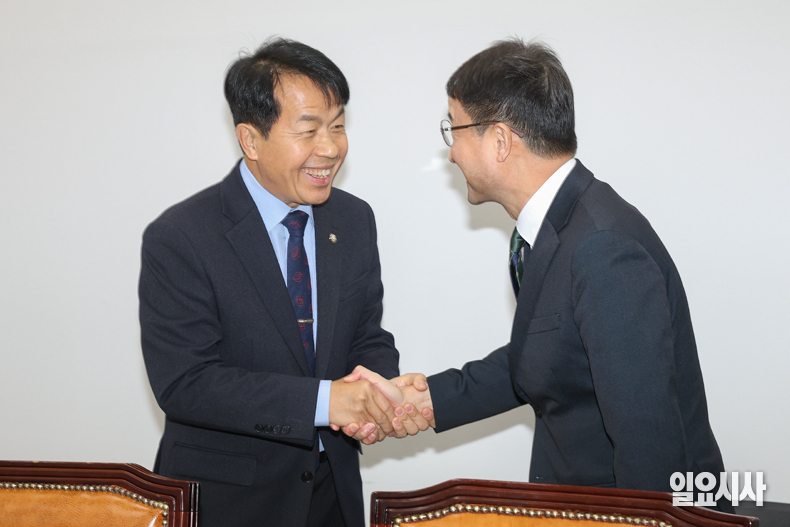 더불어민주당 한병도 신임 원내대표(왼쪽)가 13일 오후 서울 여의도 국회에서 진보당 윤종오 원내대표를 예방해 악수하고 있다.