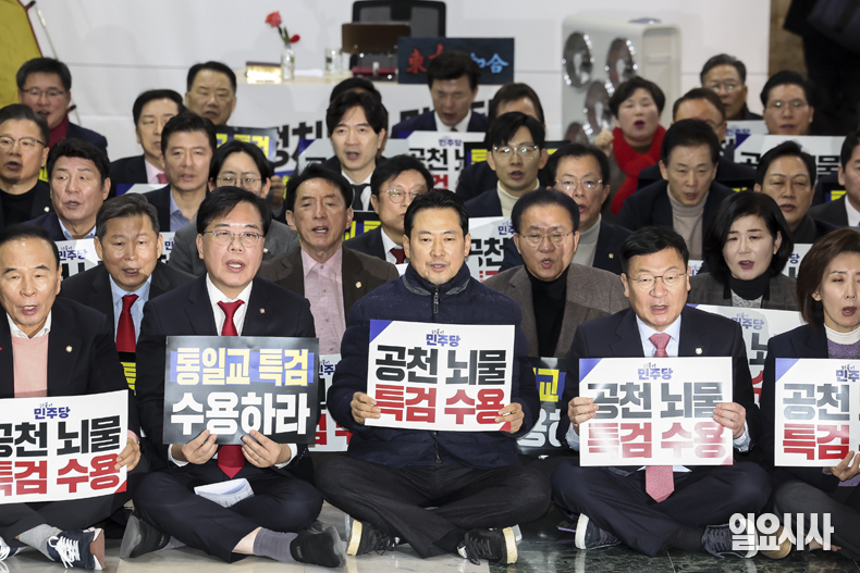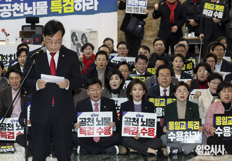 국민의힘 장동혁 대표와 송언석 원내대표 등 의원들이 19일 서울 여의도 국회 로텐더홀 단식농성장 앞에서 열린 '통일교 게이트·더불어민주당 공천뇌물 특검 촉구 규탄대회'에서 구호를 외치고 있다.