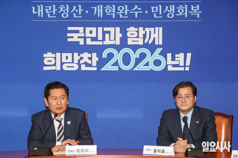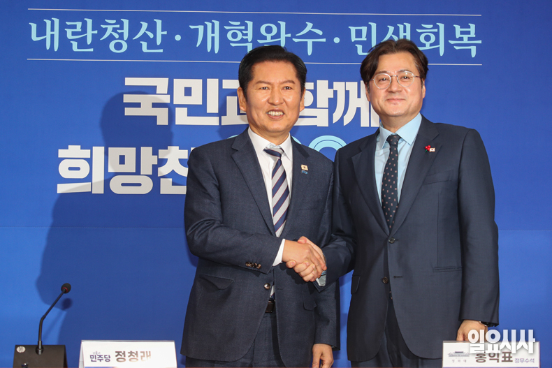더불어민주당 정청래 대표(왼쪽)가 21일 오후 서울 여의도 국회에서 홍익표 신임 대통령비서실 정무수석을 접견하며 악수하고 있다.