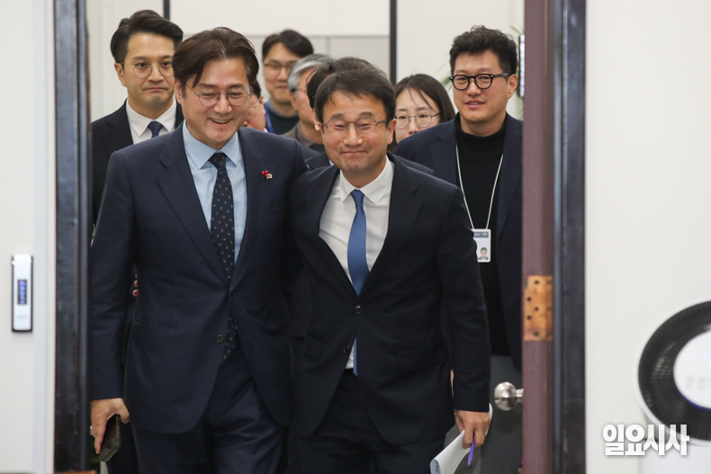 더불어민주당 한병도 원내대표(오른쪽)와 홍익표 신임 대통령비서실 정무수석이 21일 오후 서울 여의도 국회 원내대표실로 어깨동무를 하고 들어서고 있다.