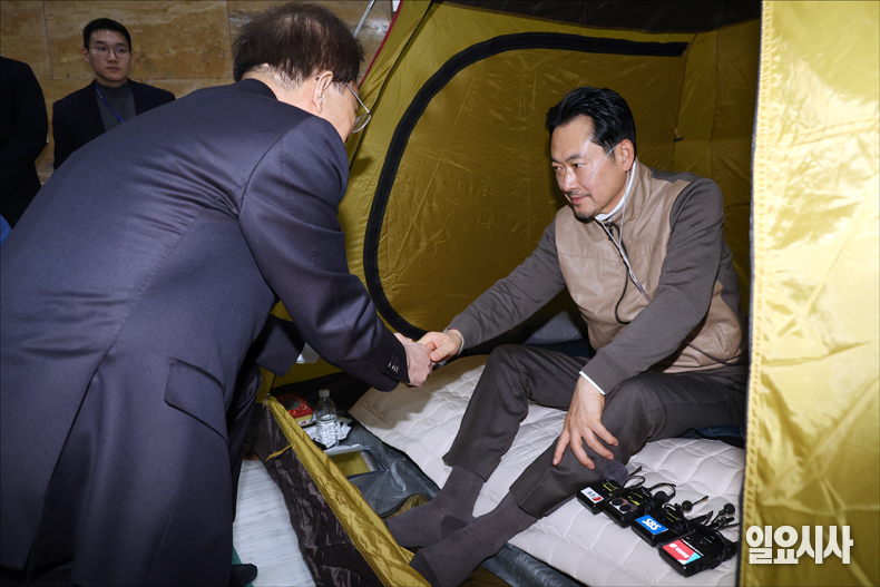 이석연 국민통합위원장이 21일 오후 서울 여의도 국회 로텐더홀에 통일교·공천헌금 등 ‘쌍특검’ 수용을 요구하며 단식농성 중인 국민의힘 장동혁 대표를 만나 인사하고 있다.