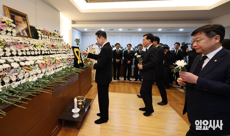 국민의힘 장동혁 대표(왼쪽 첫 번째)와 송언석 원내대표(왼쪽 두 번째) 등 지도부가 30일 오전 서울 종로구 서울대학교병원 장례식장에 마련된 고 이해찬 전 국무총리의 빈소를 찾아 조문하고 있다.
