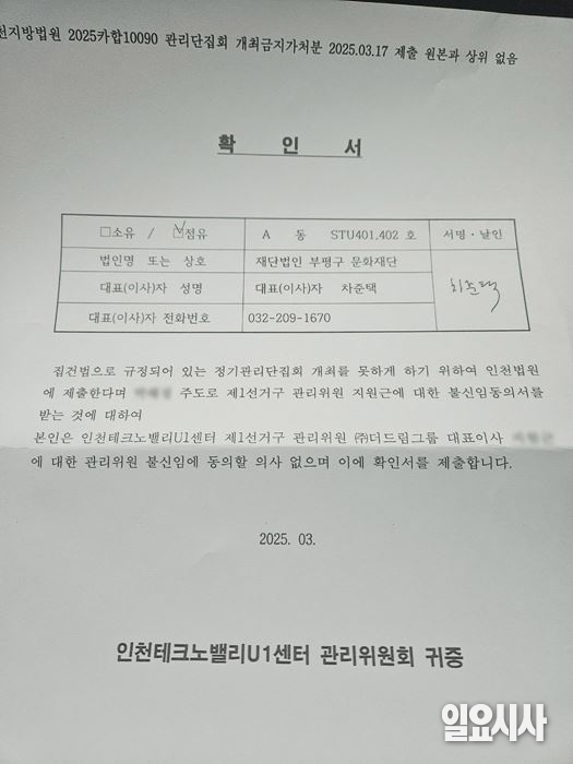 관리인 해임을 둘러싼 갈등은 결국 법적 다툼으로 이어졌다. 관리인 해임 관련 가처분 소송 과정에서 법원에 제출된 서류 중 부평구청이 관리인 해임에 동의하지 않는다는 취지의 확인서가 포함됐고, 해당 문서에는 차준택 부평구청장의 서명과 날인이 기재돼있었다.