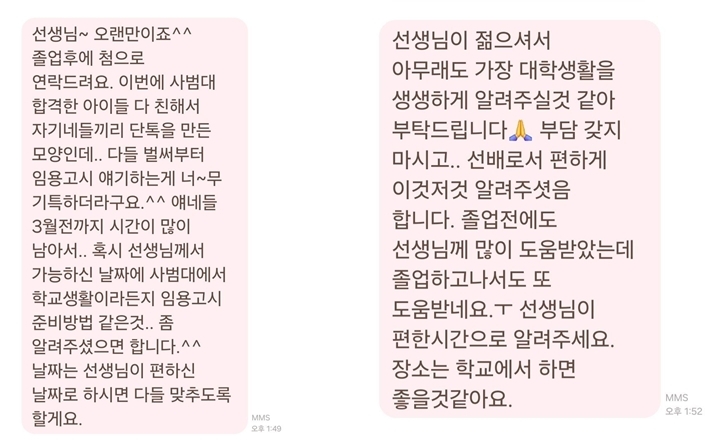 이어 “날짜는 선생님이 편하신 날짜로 하면 아이들이 맞추겠다”면서도 “선생님이 젊으셔서 대학 생활을 가장 생생하게 알려주실 것 같아 부탁드린다. 부담 갖지 마시고 선배로서 편하게 이것저것 알려달라”고도 했다.