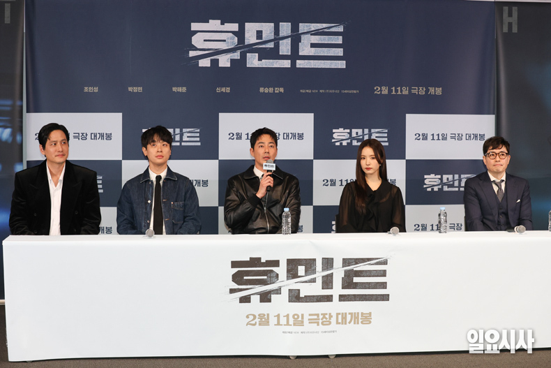 배우 박해준(왼쪽부터), 조인성, 신세경, 박정민과 류승완 감독이 4일 오후 서울 용산구 CGV용산아이파크몰에서 열린 영화 <휴민트> 언론배급시사회에서 포토타임을 갖고 있다.