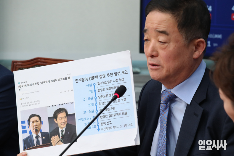 더불어민주당 강득구 최고위원이 6일 오전 서울 여의도 국회에서 열린 최고위원회의에서 ‘합당 대외비 문건’ 관련 보도 내용이 적힌 피켓을 들고 정청래 대표의 해명을 요구하고 있다.