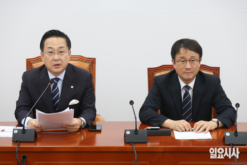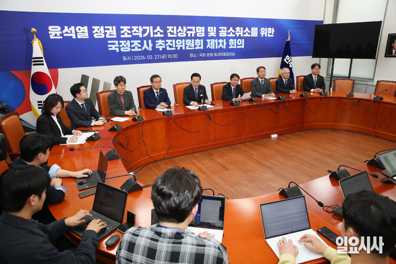 더불어민주당 한병도 원내대표가 27일 오후 서울 여의도 국회에서 열린 ‘윤석열 정권 조작기소 진상규명 및 공소취소를 위한 국정조사 추진위원회 1차 회의’에서 모두발언을 하고 있다.