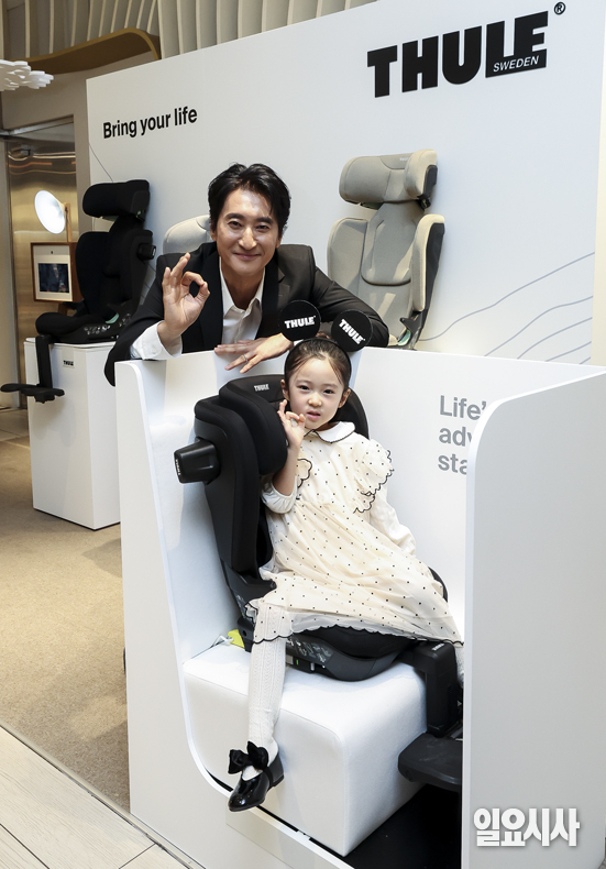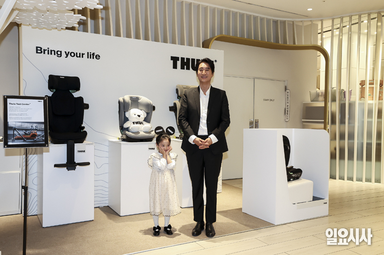 배우 신현준과 딸 신민서 부녀가 4일 오전 서울 서초구 신세계백화점 강남점 툴레 주니어 카시트 팝업존에서 열린 '툴레 키즈 한국 공식 런칭 포토콜'에서 제품을 시연하고 있다.