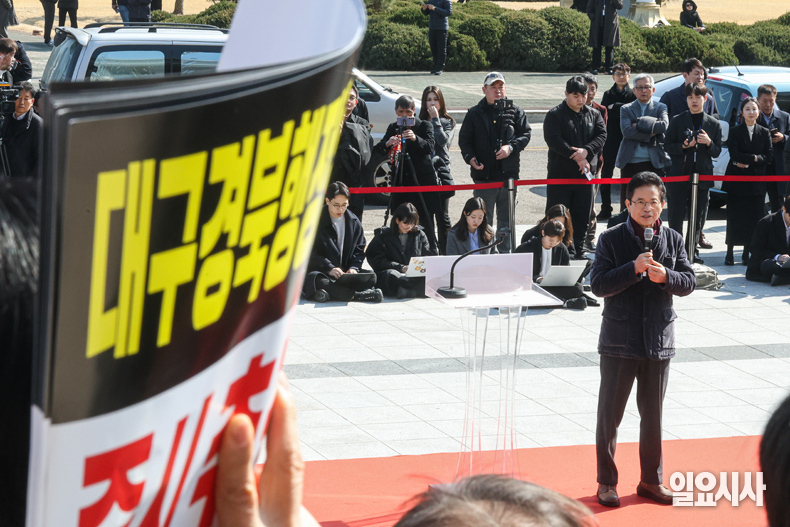 이철우 경북도지사가 4일 오후 서울 여의도 국회 본관 앞 계단에서 열린 ‘대구경북 행정통합특별법 통과 촉구 결의대회’에서 발언하고 있다.