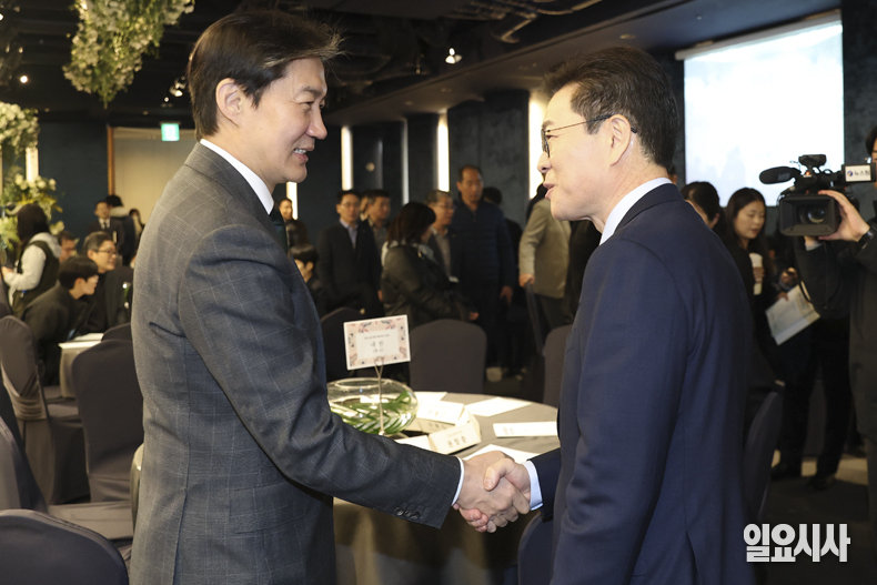 조국혁신당 조국 대표(왼쪽)와 더불어민주당 서울시장 예비후보인 정원오 전 성동구청장이 10일 오전 서울 여의도 한국노총에서 열린 한국노총 창립 80주년 기념식에서 악수를 하고 있다.