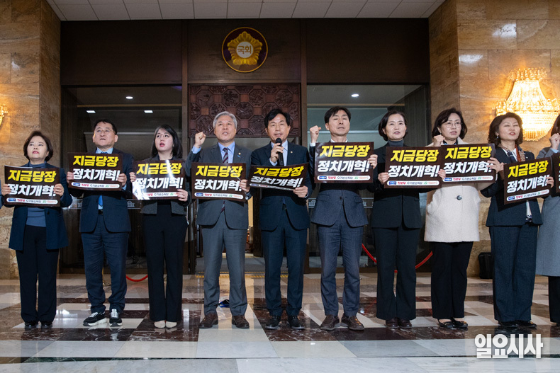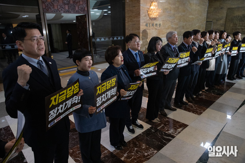 개혁진보 4당 의원들이 12일 오후 서울 여의도 국회 본회의장 앞에서 정치개혁 촉구 피켓팅을 하고 있다.