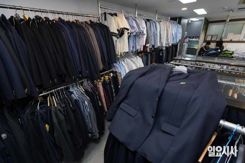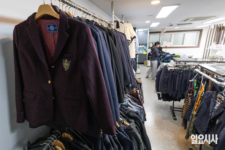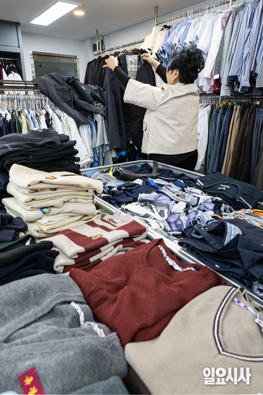 18일 오후 서울 송파구 나눔 교복 매장을 찾은 시민이 진열된 교복을 살펴보고 있다.