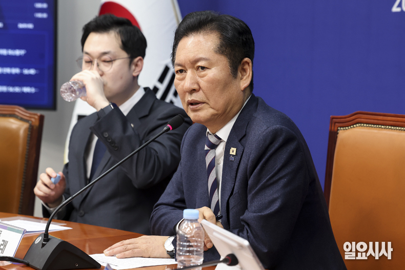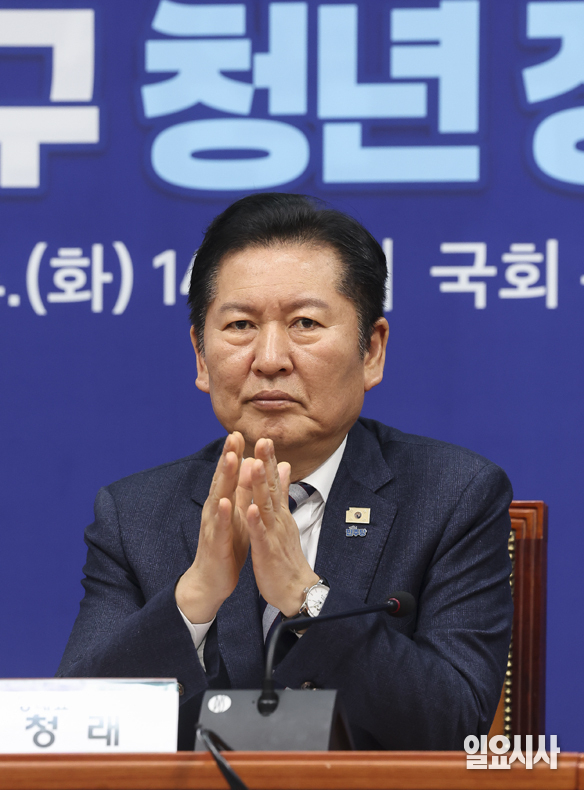 더불어민주당 정청래 대표가 24일 오후 서울 여의도 국회에서 열린 청년 관계 기구 청년 정책 제안 간담회에서 발언하고 있다.