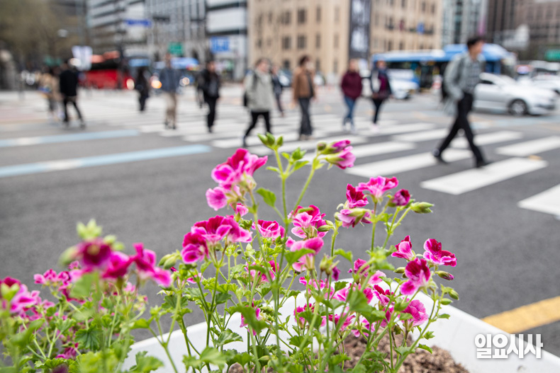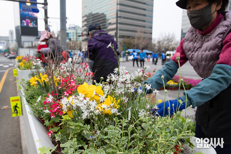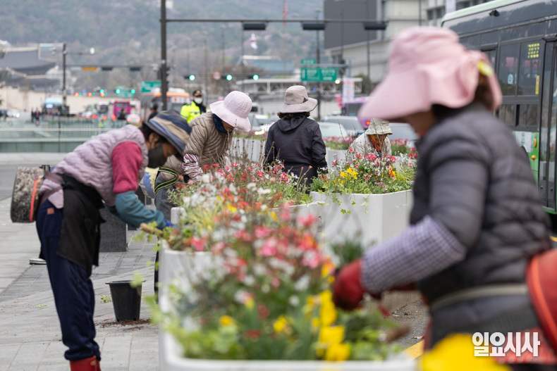 서울시 관계자들이 1일 오전 서울 종로구 광화문광장 화단에 봄꽃을 심고 있다.
