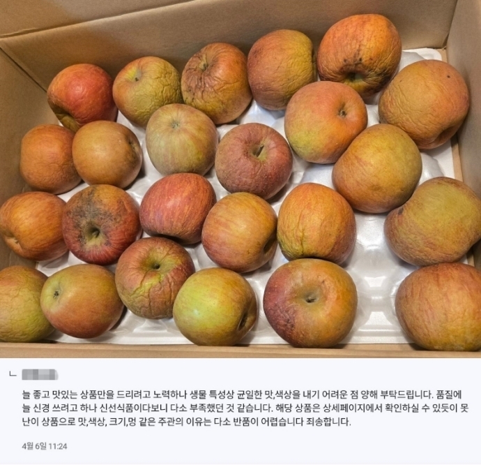 [일요시사 취재2팀] 김준혁 기자 = 온라인 플랫폼에서 이른바 ‘못난이 사과’를 구매한 소비자가 먹기 어려운 상태의 제품을 받았다는 사연이 알려지면서 논란이 일고 있다.